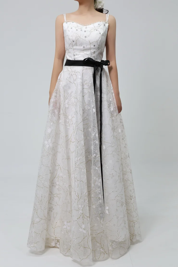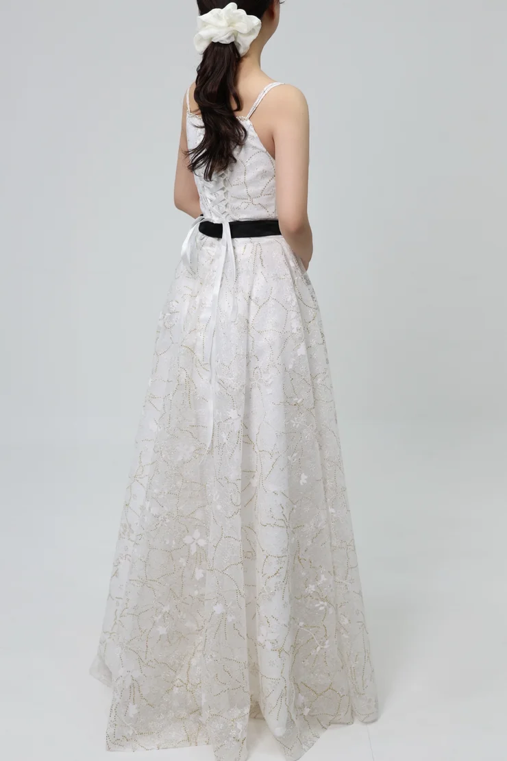금빛 패턴이 자연스럽게 스커트 전면을 수놓은 드레스입니다.