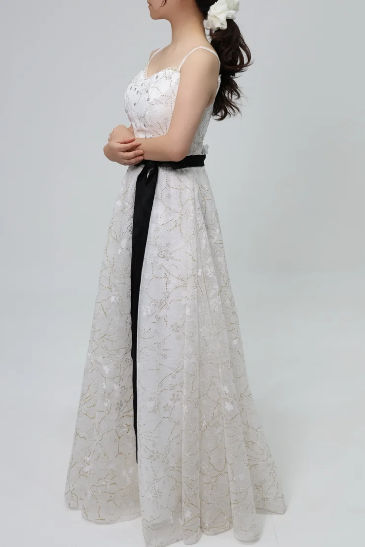 금빛 패턴이 자연스럽게 스커트 전면을 수놓은 드레스입니다.