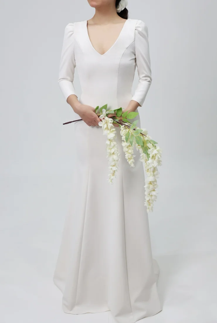 차르르 흐르는 듯한 텍스처가 특징인 도비실크 소재로 완성된 머메이드 드레스입니다.